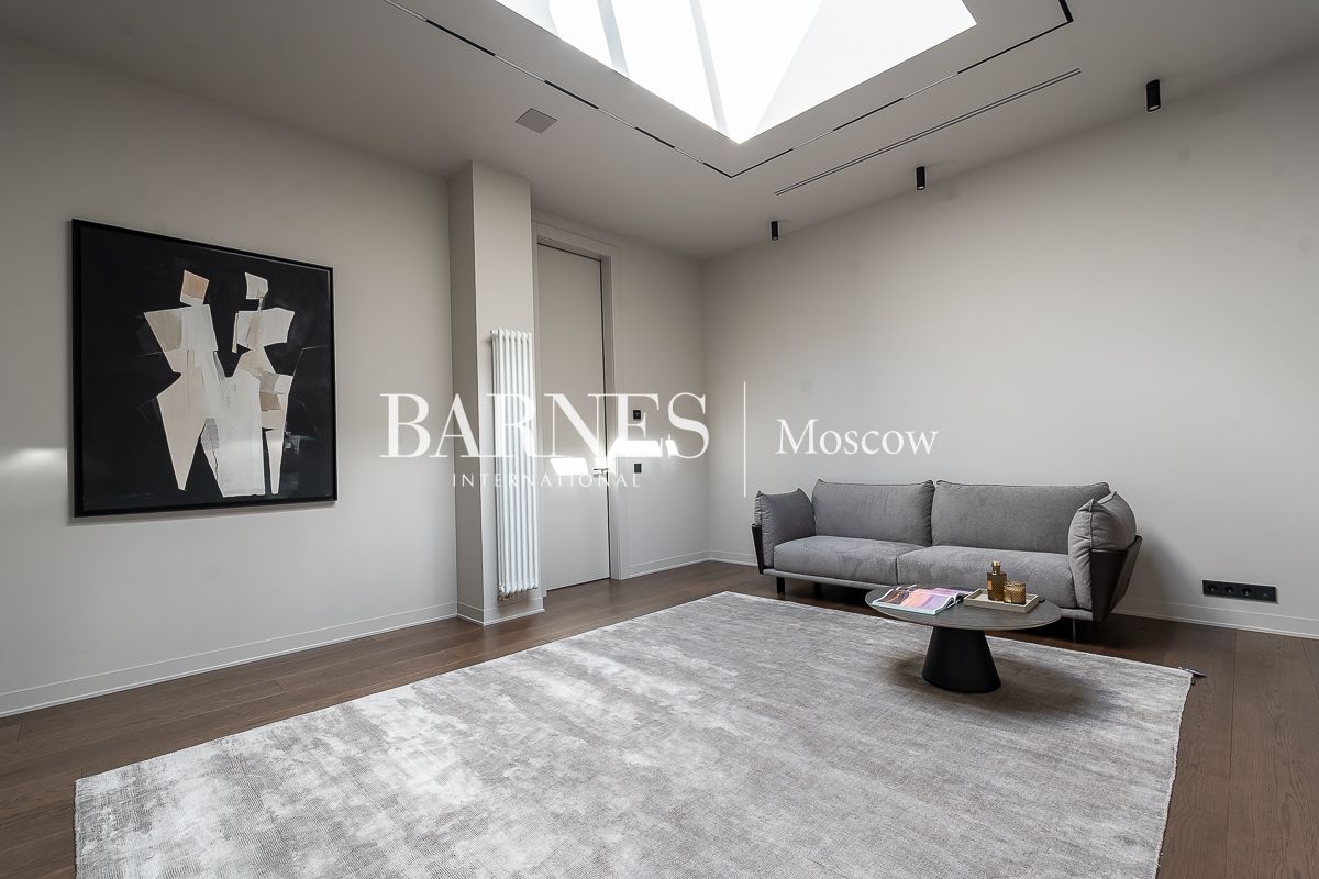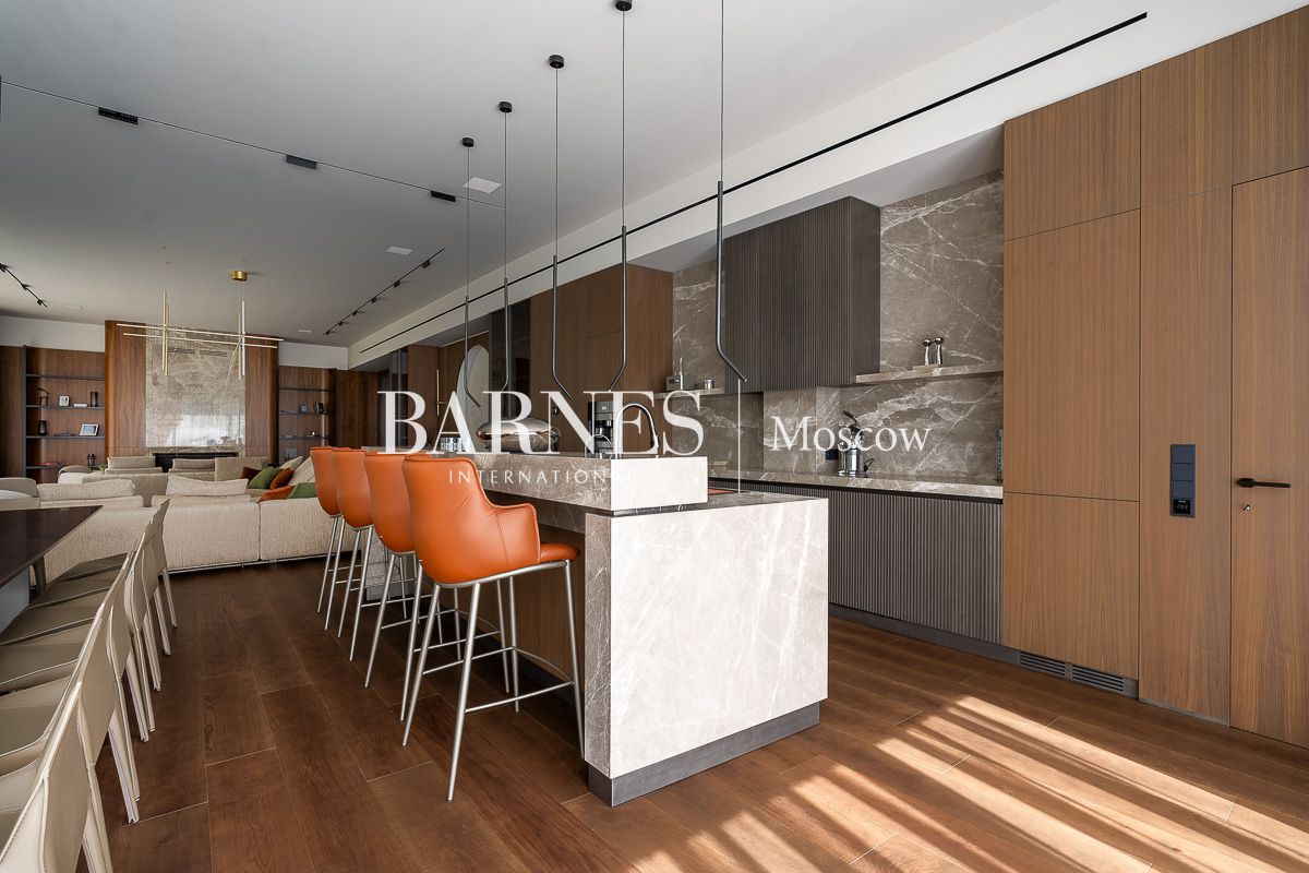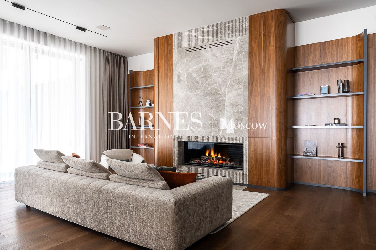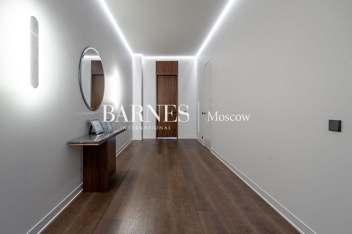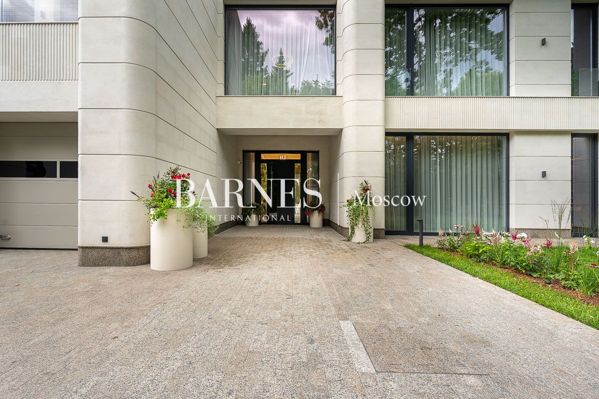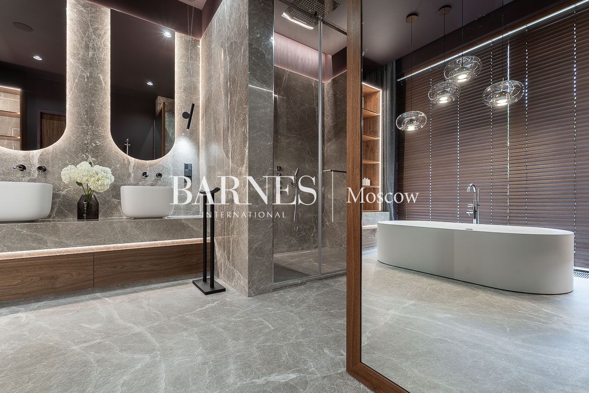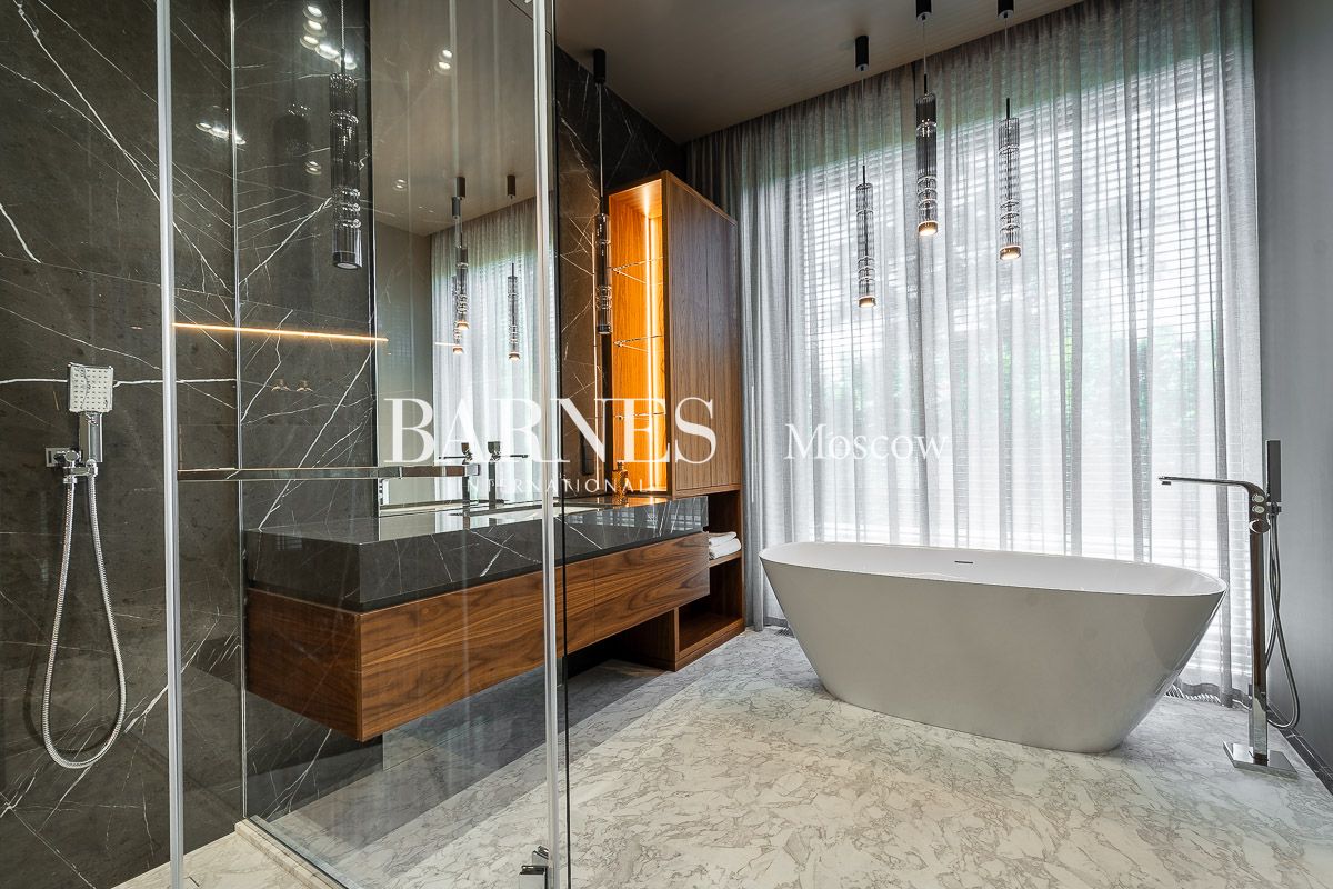 В отделке использованы высококачественные натуральные материалы: мрамор и ценные породы дерева. Интерьер укомплектован мебелью ведущих итальянских брендов: Minotti, Poltrona Frau, Poliform и Porada. Кухня оснащена техникой Miele, а постирочная — профессиональным оборудованием Asko.