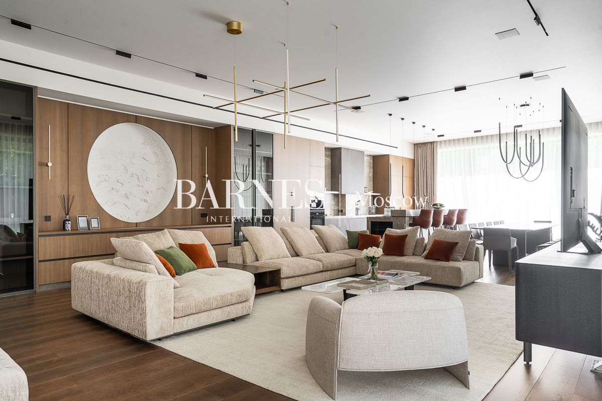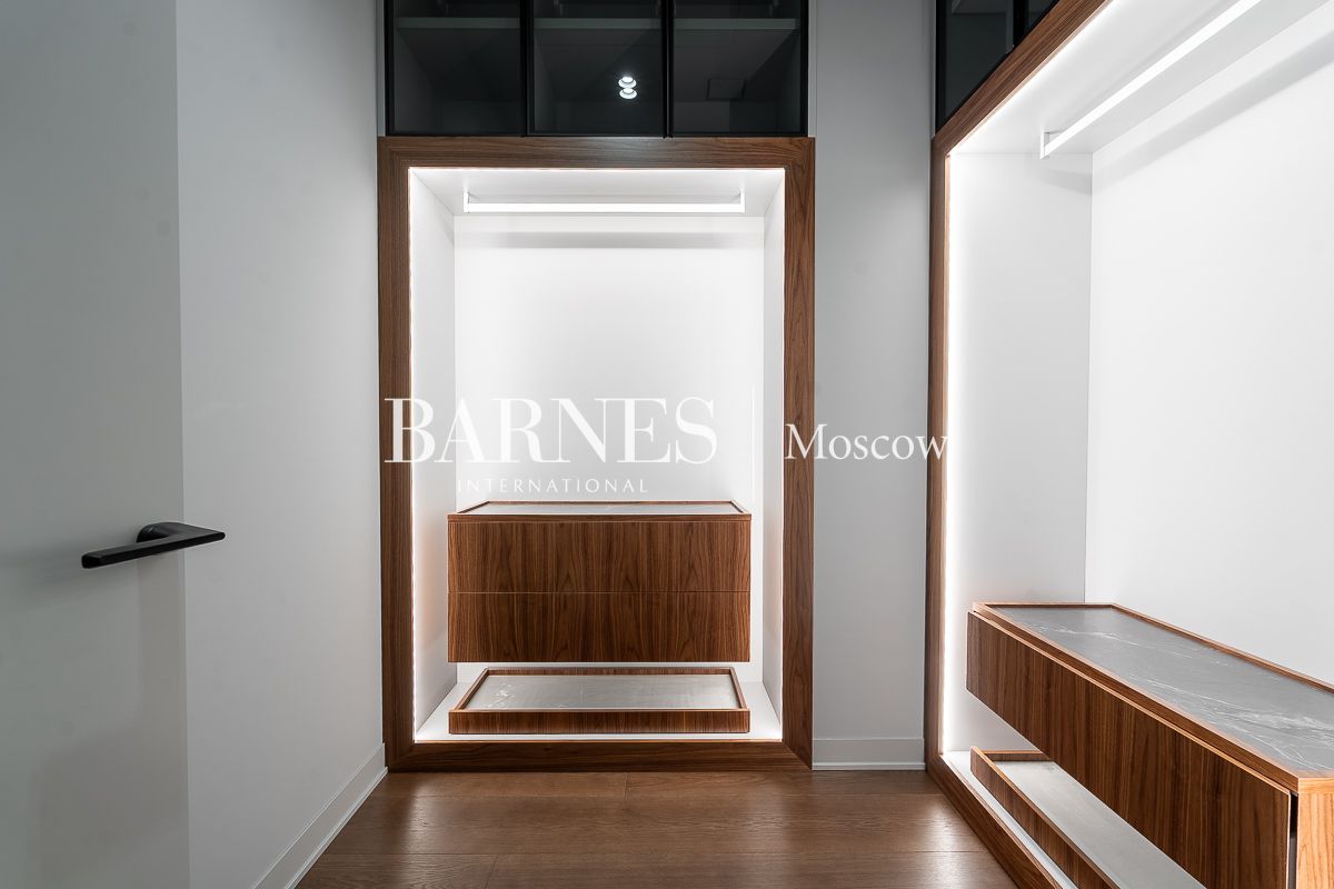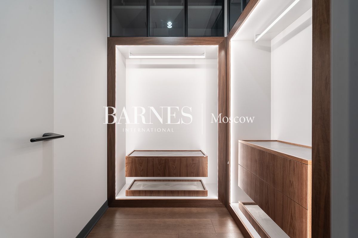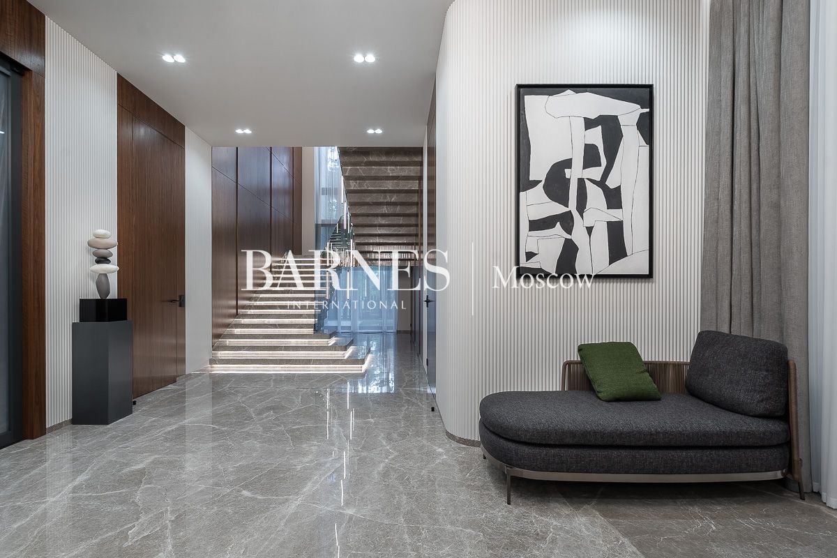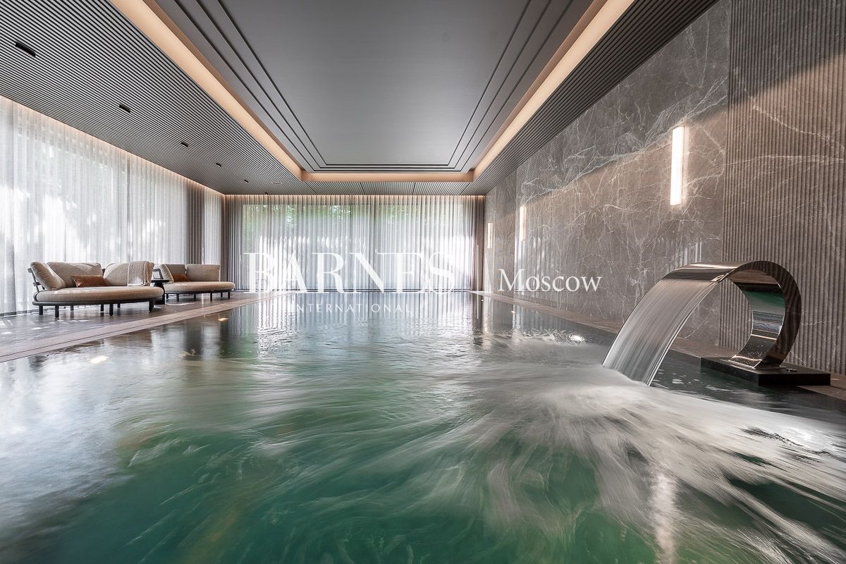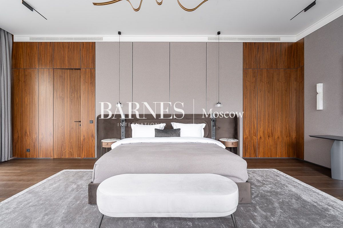 В отделке использованы высококачественные натуральные материалы: мрамор и ценные породы дерева. Интерьер укомплектован мебелью ведущих итальянских брендов: Minotti, Poltrona Frau, Poliform и Porada. Кухня оснащена техникой Miele, а постирочная — профессиональным оборудованием Asko.