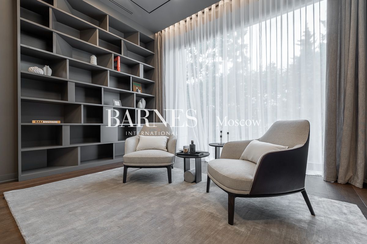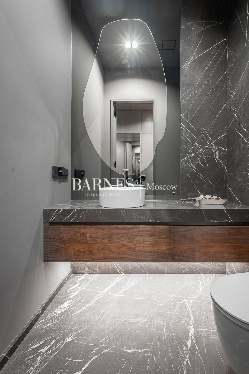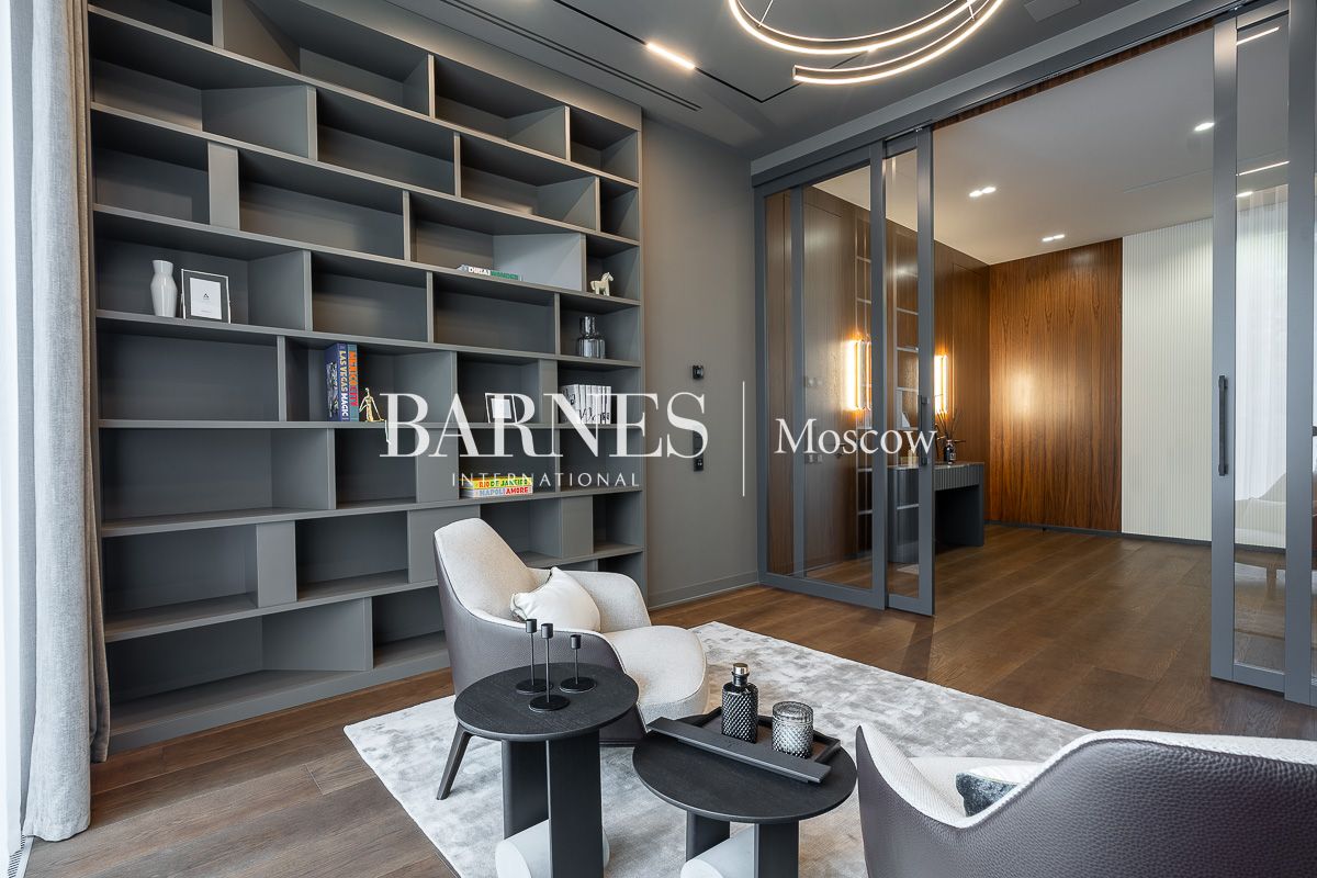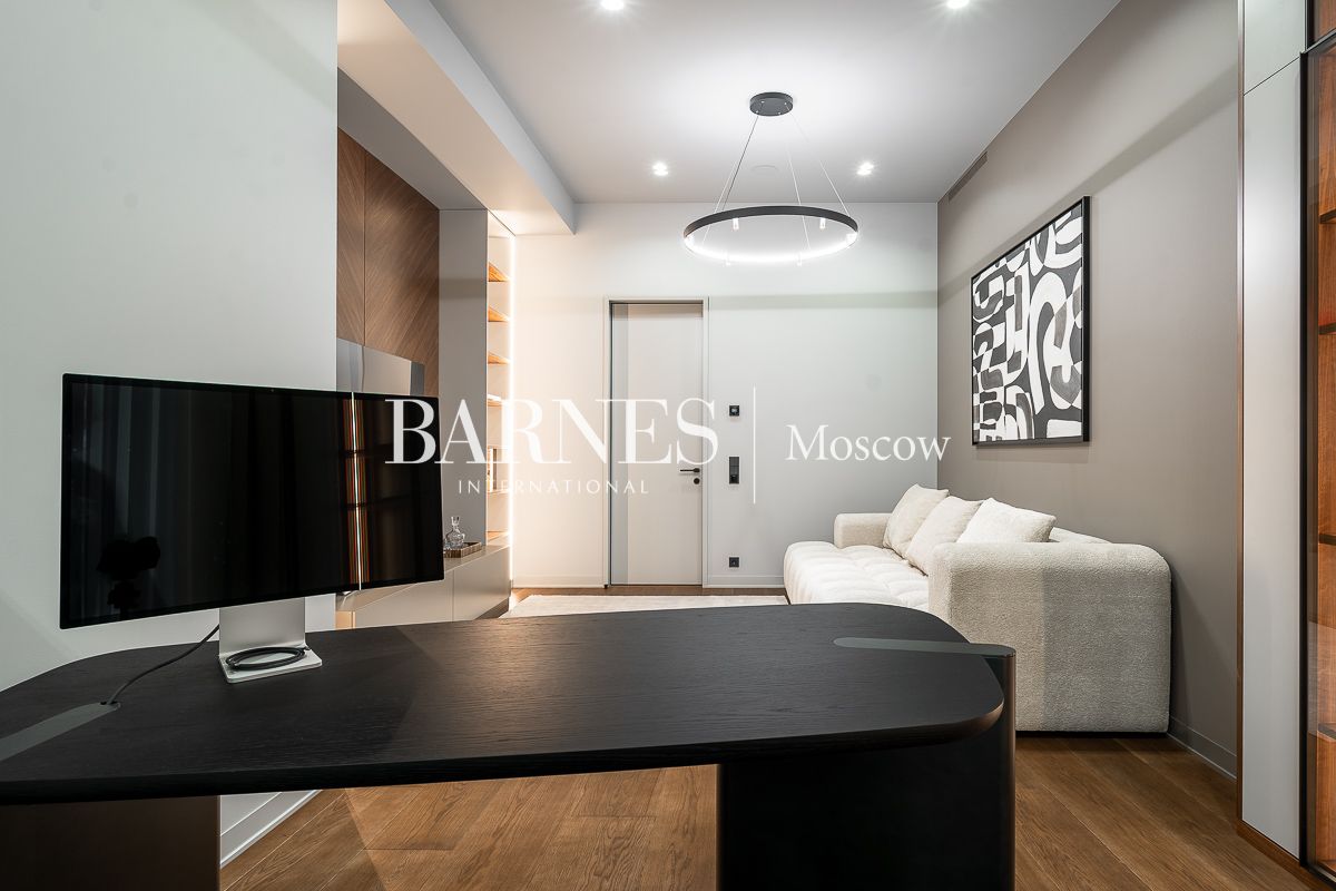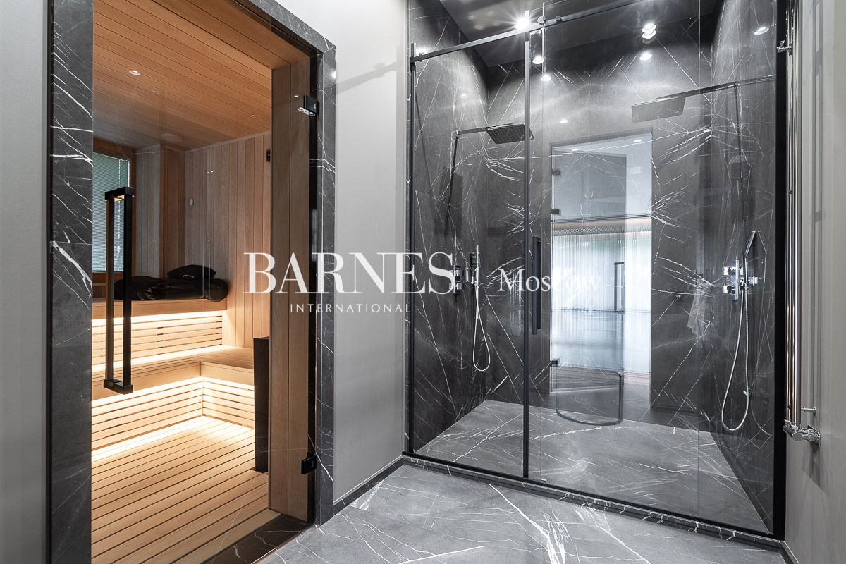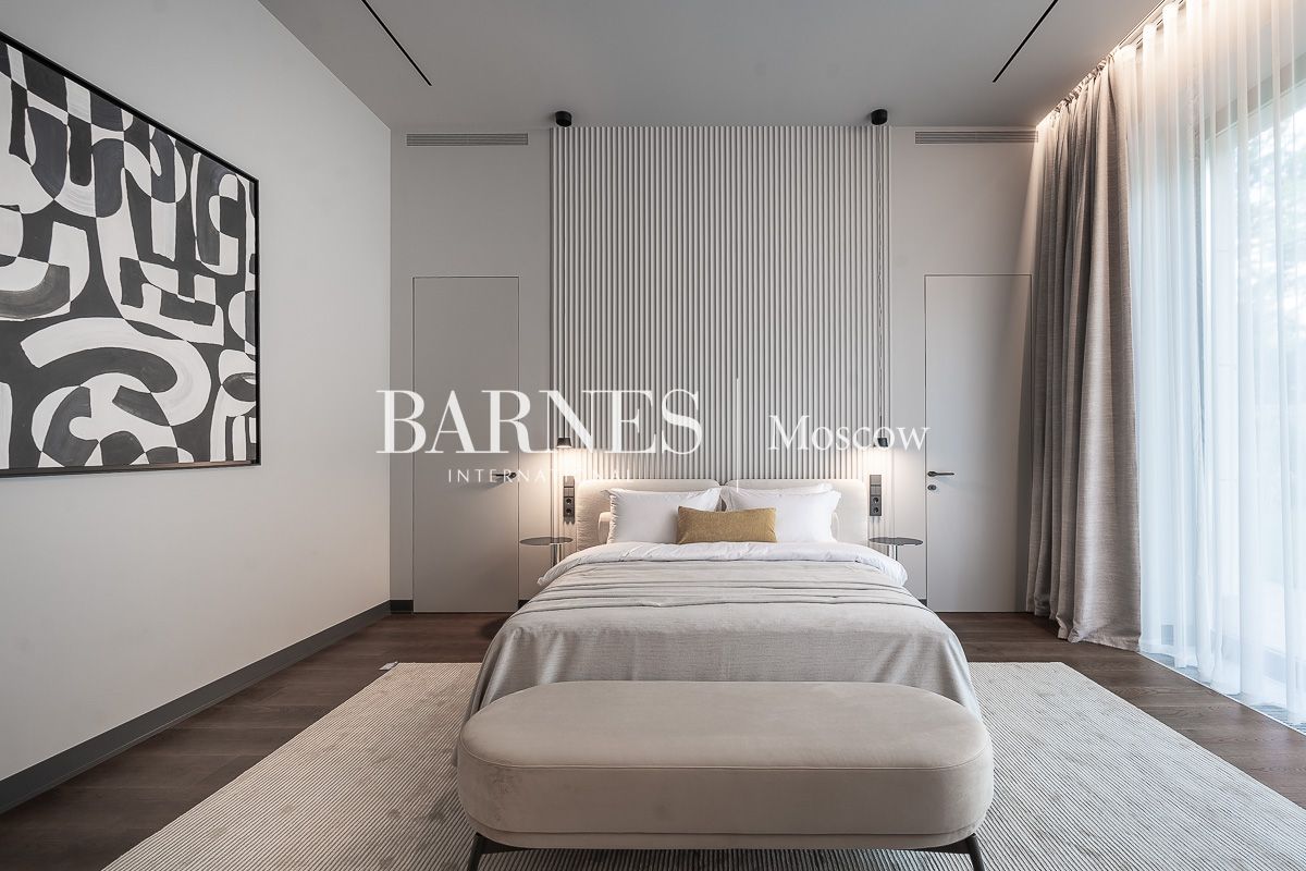 В отделке использованы высококачественные натуральные материалы: мрамор и ценные породы дерева. Интерьер укомплектован мебелью ведущих итальянских брендов: Minotti, Poltrona Frau, Poliform и Porada. Кухня оснащена техникой Miele, а постирочная — профессиональным оборудованием Asko.