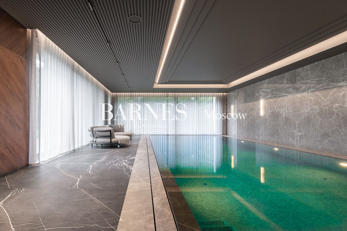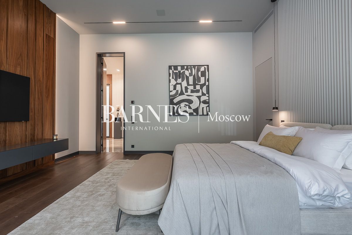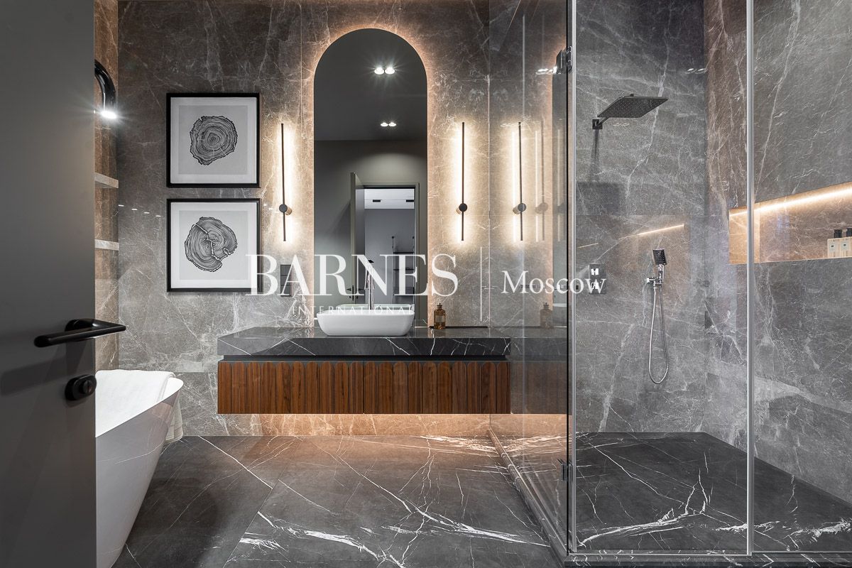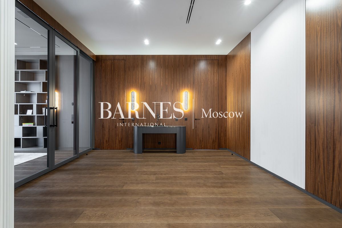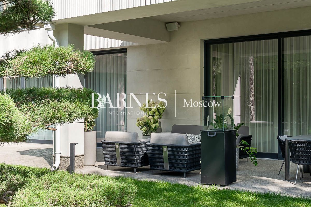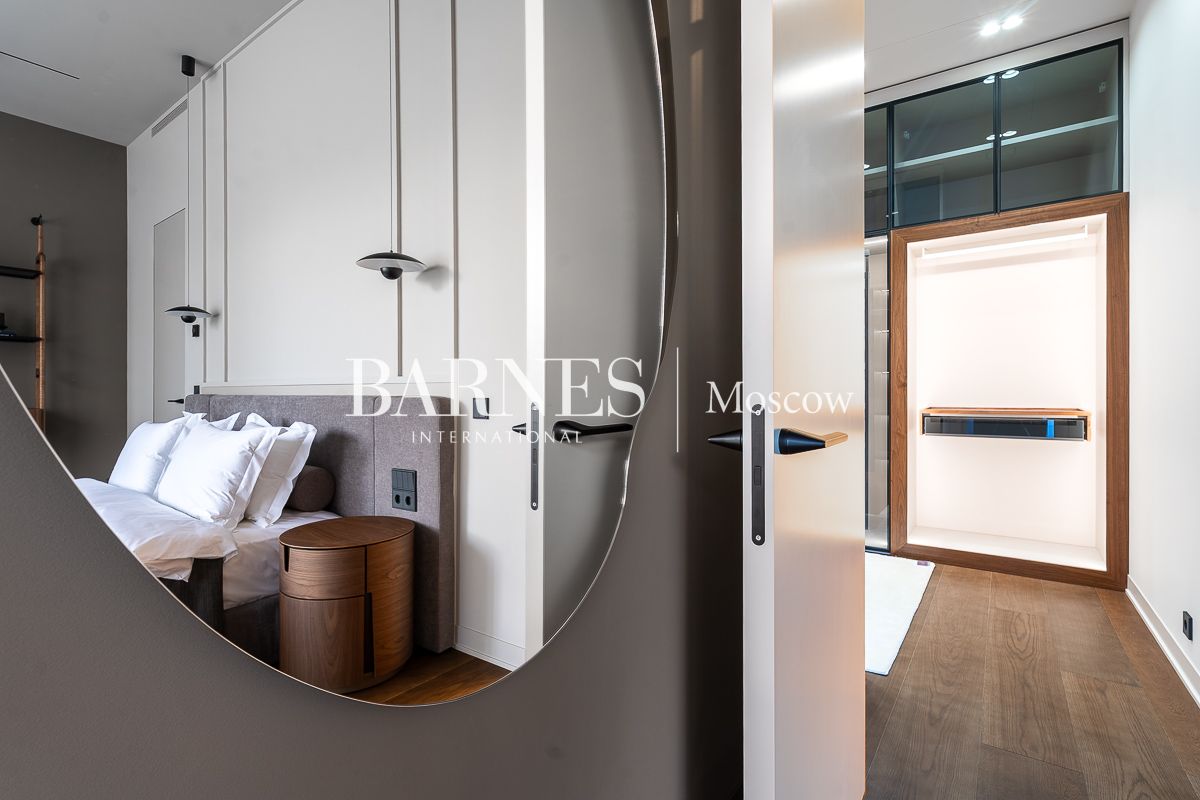 В отделке использованы высококачественные натуральные материалы: мрамор и ценные породы дерева. Интерьер укомплектован мебелью ведущих итальянских брендов: Minotti, Poltrona Frau, Poliform и Porada. Кухня оснащена техникой Miele, а постирочная — профессиональным оборудованием Asko.
