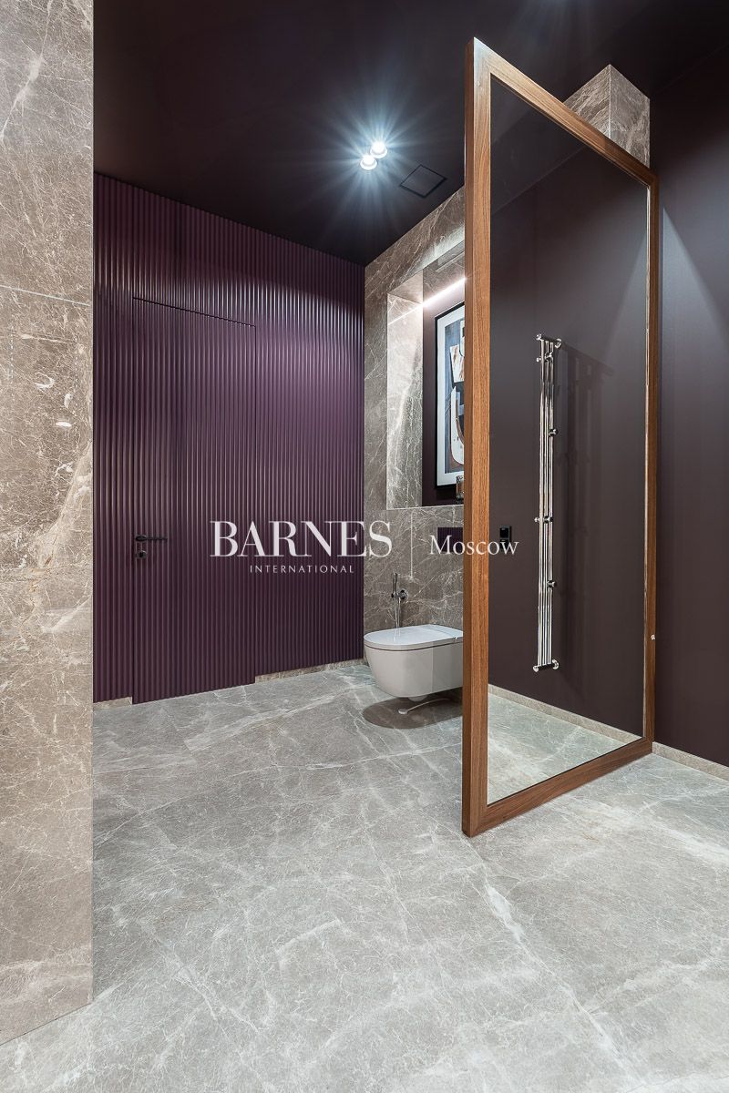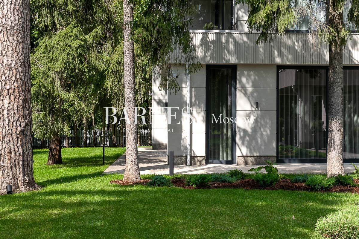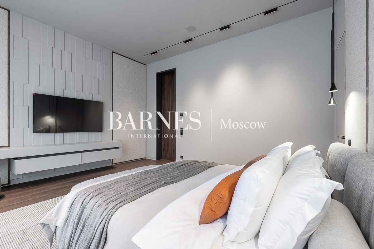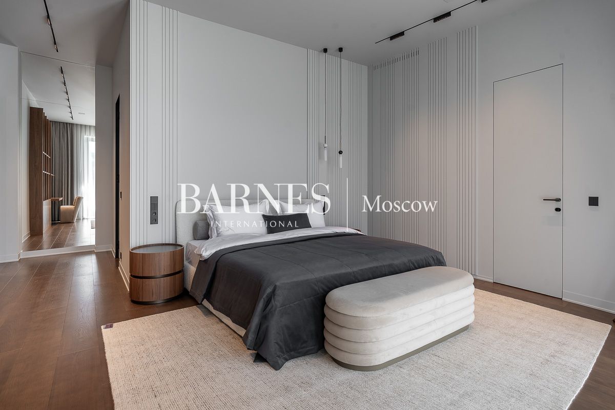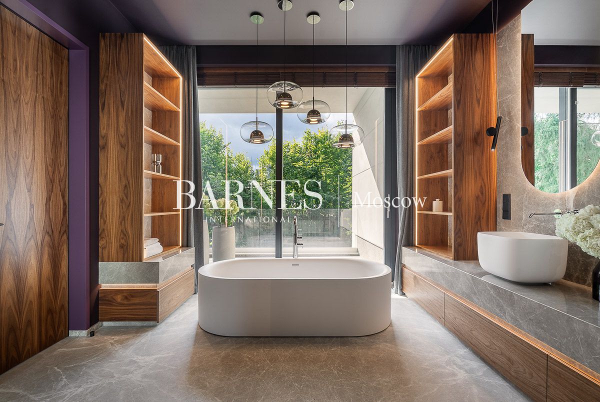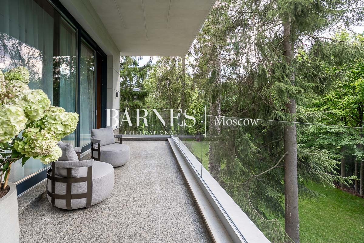 В отделке использованы высококачественные натуральные материалы: мрамор и ценные породы дерева. Интерьер укомплектован мебелью ведущих итальянских брендов: Minotti, Poltrona Frau, Poliform и Porada. Кухня оснащена техникой Miele, а постирочная — профессиональным оборудованием Asko.