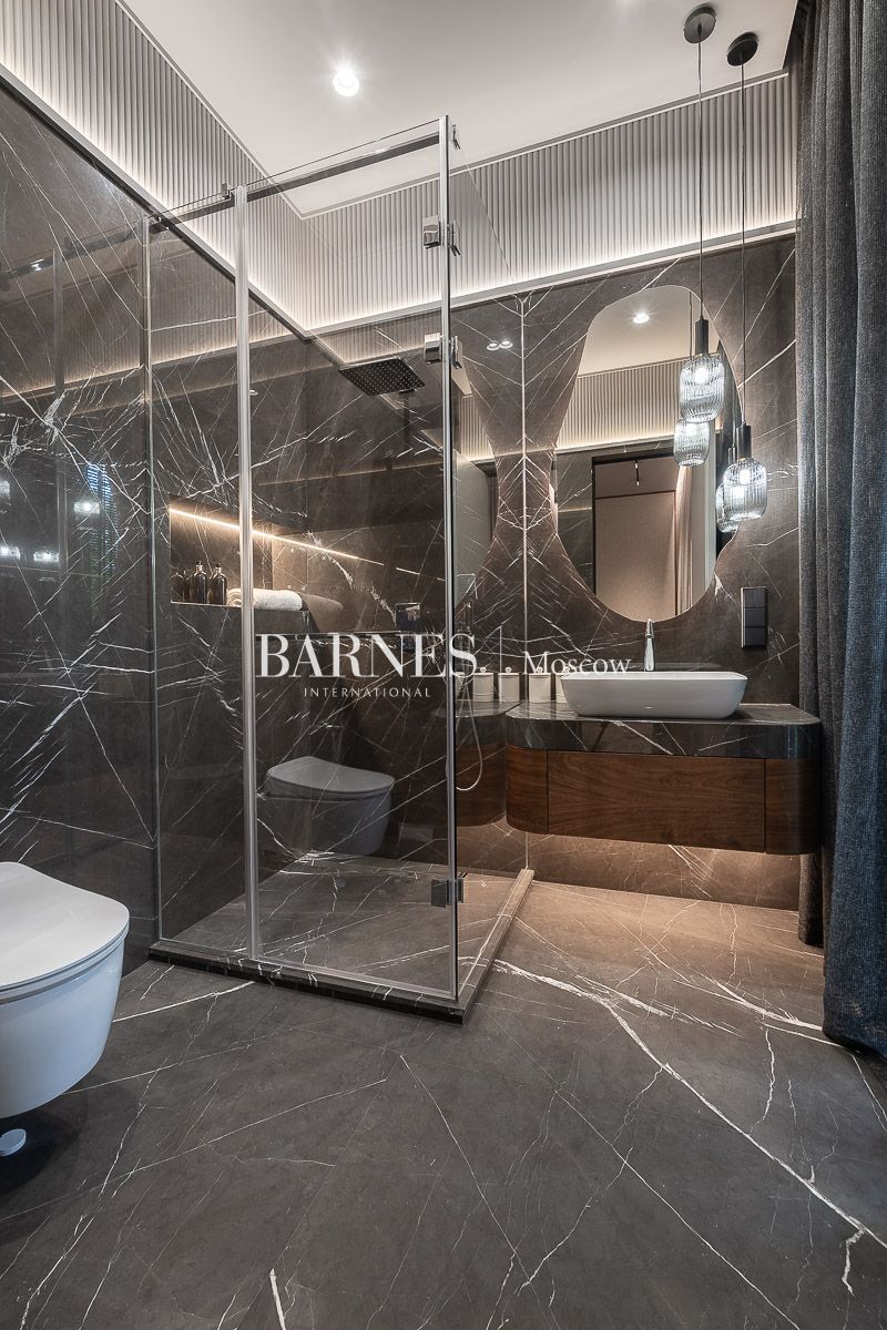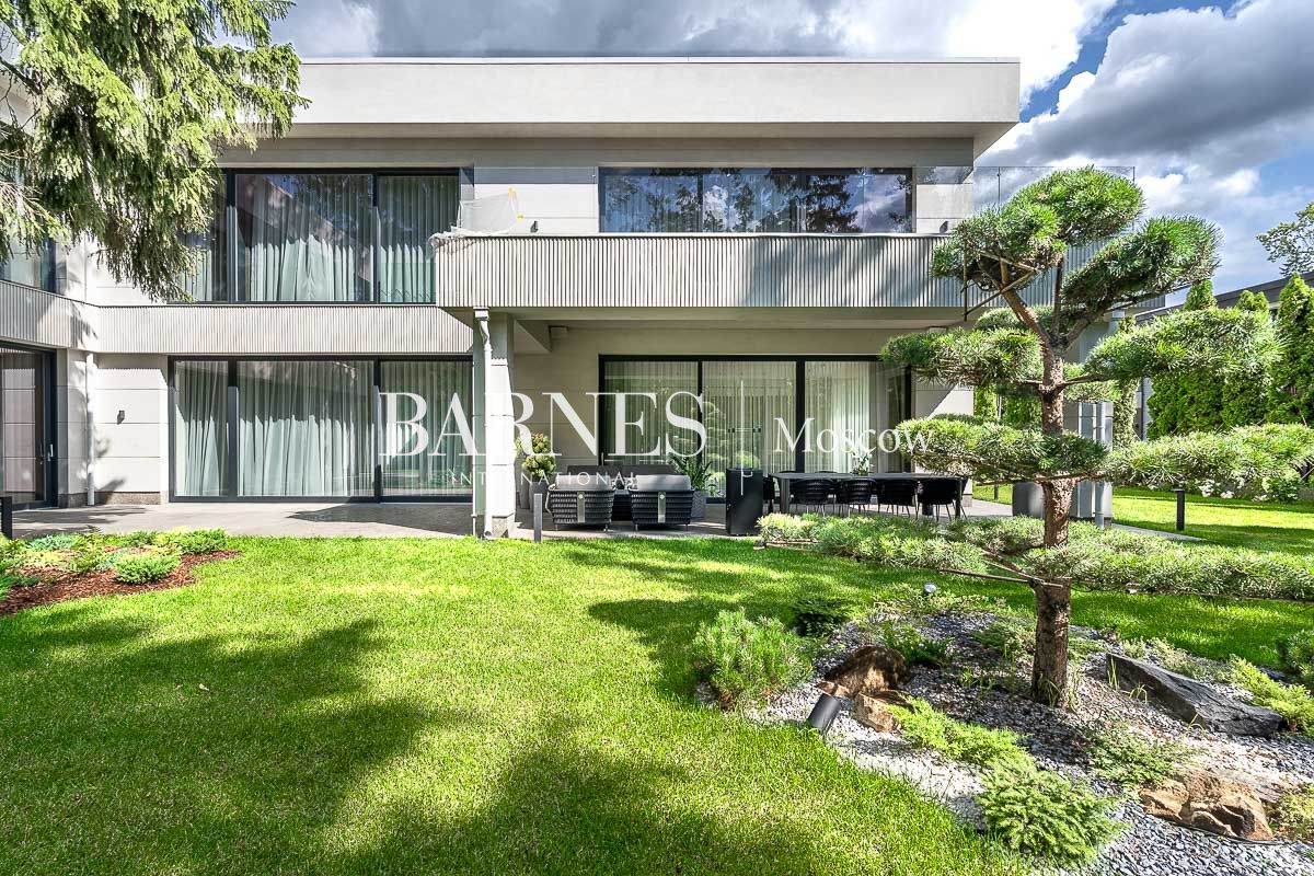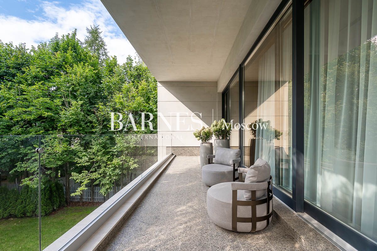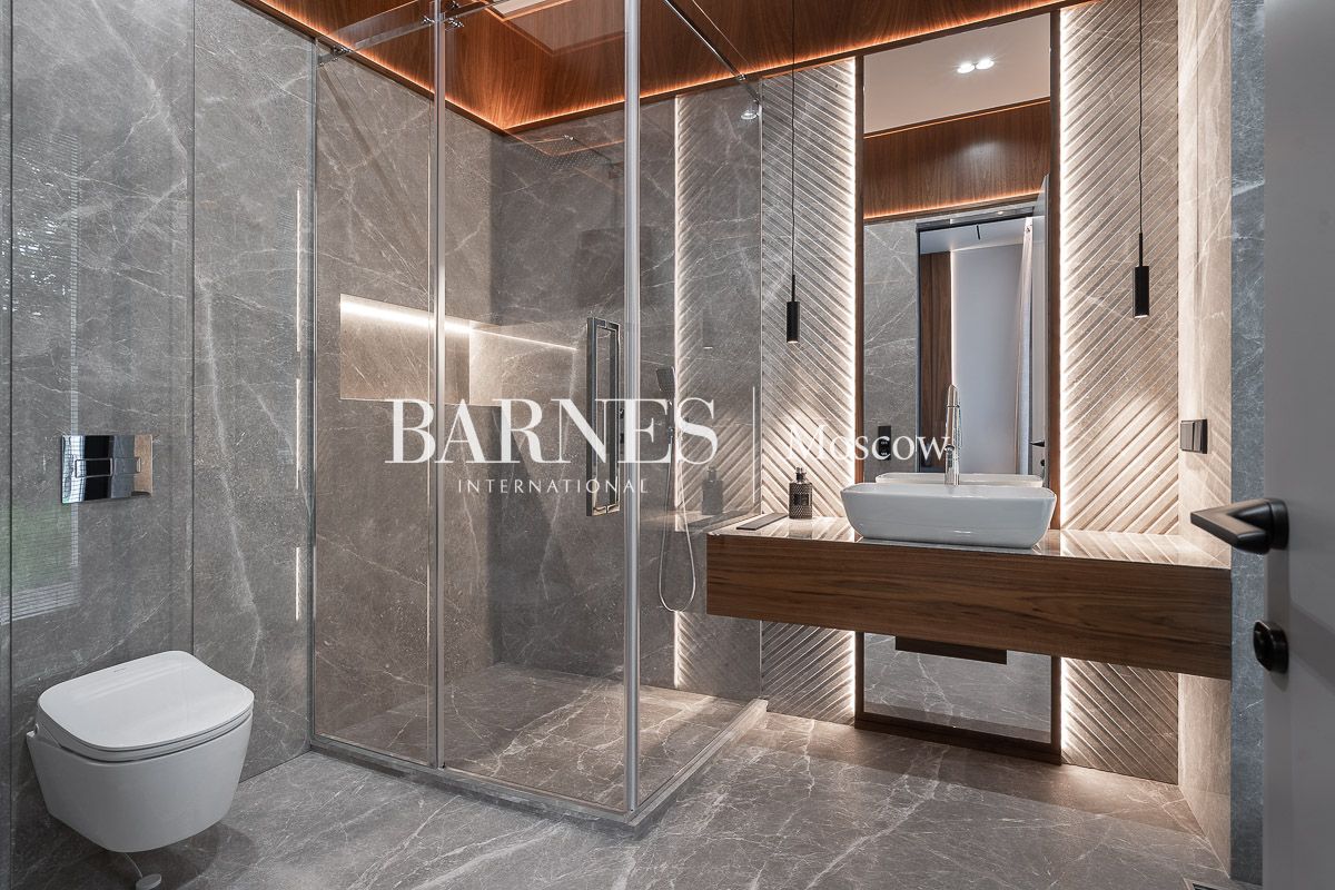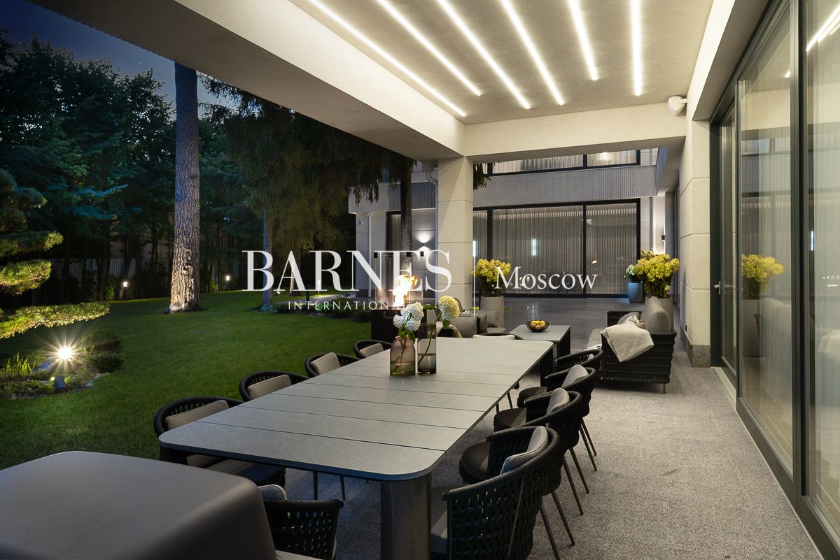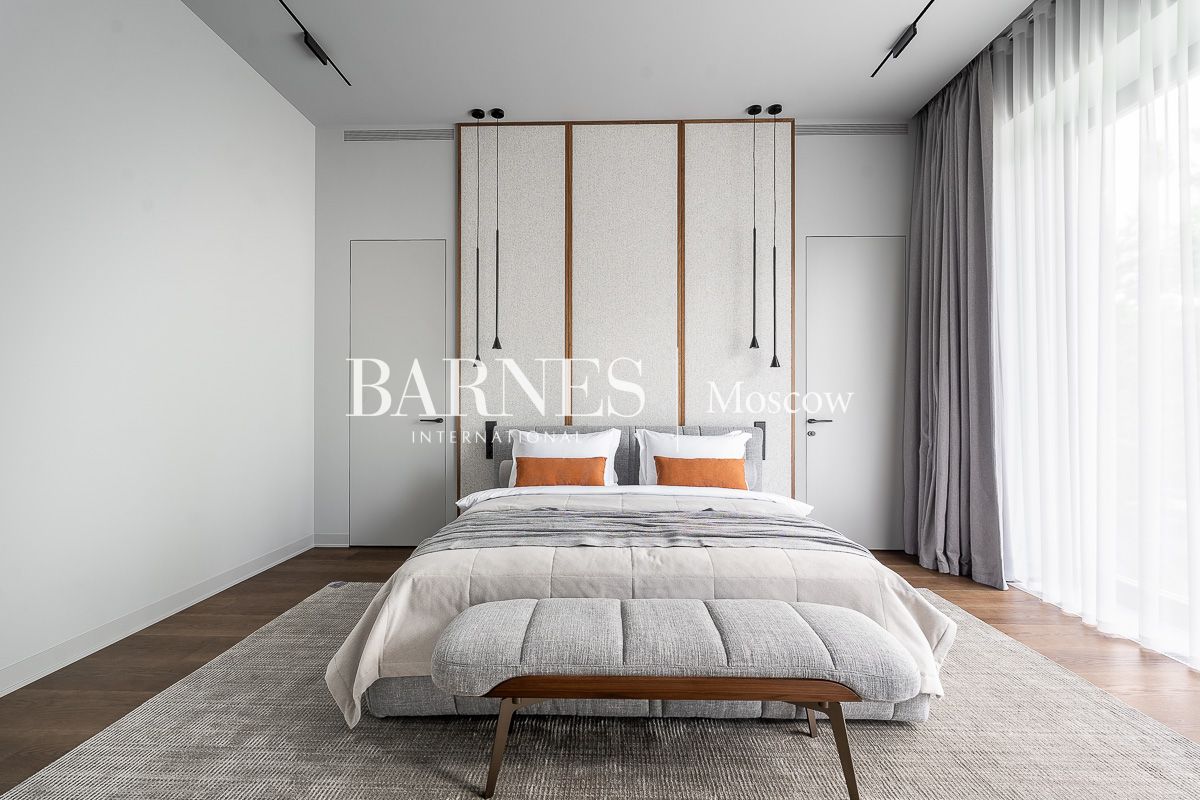 В отделке использованы высококачественные натуральные материалы: мрамор и ценные породы дерева. Интерьер укомплектован мебелью ведущих итальянских брендов: Minotti, Poltrona Frau, Poliform и Porada. Кухня оснащена техникой Miele, а постирочная — профессиональным оборудованием Asko.