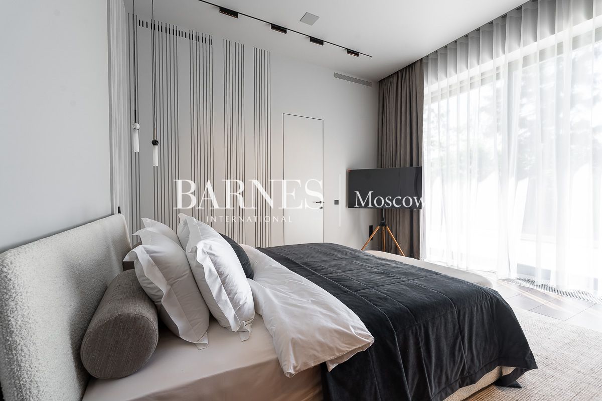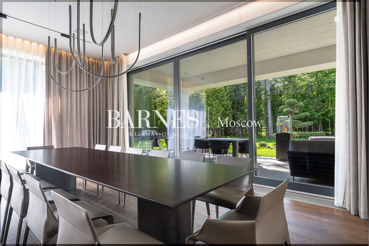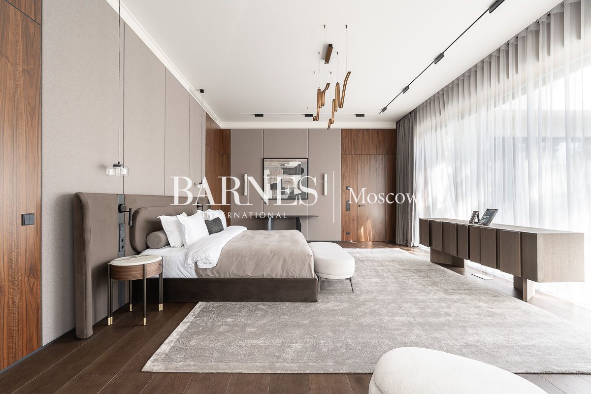 В доме расположены пять спальных блоков, каждый из которых дополнен собственной гардеробной и санузлом. Просторное пространство объединяет зону кухни, столовую и гостиную с камином, выходящую на открытые балконы и террасы. Предусмотрены квартира для персонала и гараж на три автомобиля. Зона отдыха включает в себя спа-комплекс с сауной и переливным бассейном. Технический блок объединяет подсобные помещения, рабочую кухню и постирочную.