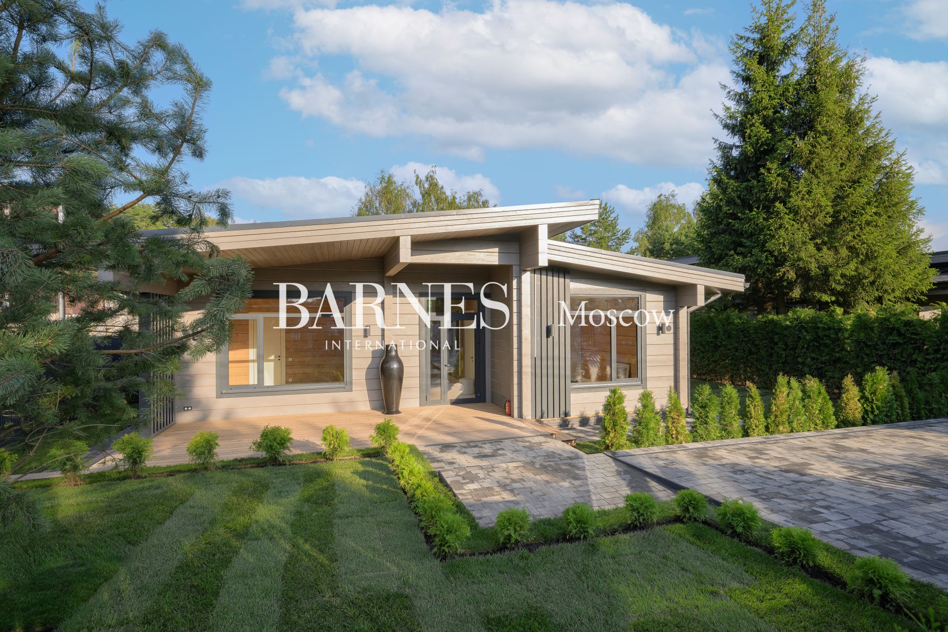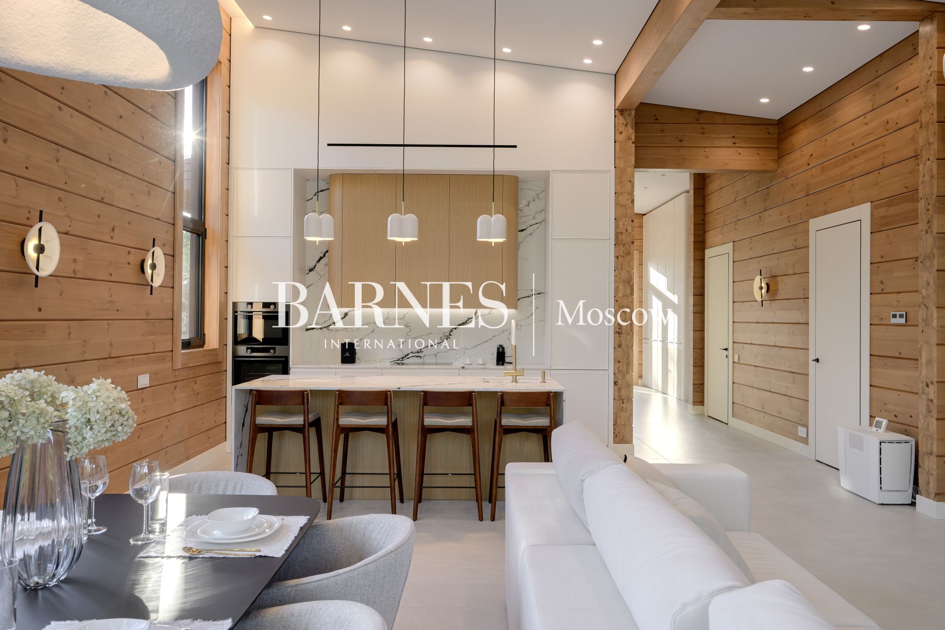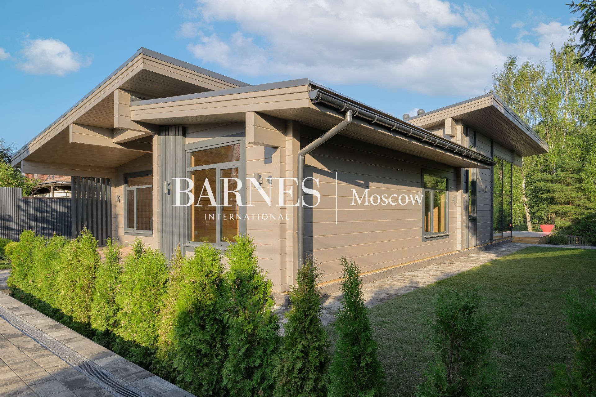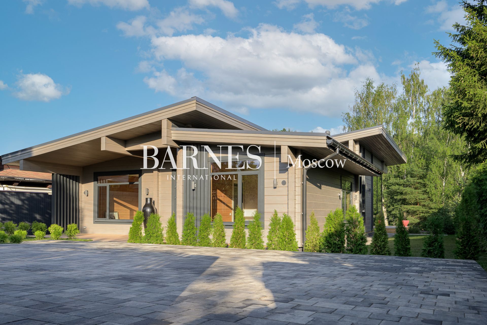 Архитектурный стиль дома можно охарактеризовать как современный, с элементами минимализма, что подчеркивается использованием натуральных материалов и панорамного остекления. Брус, из которого построен дом, придает ему особую теплоту и естественность, а большие окна позволяют наслаждаться видами на окружающую природу. Внутреннее пространство дома продумано до мелочей: четыре спальни и три ванные комнаты обеспечивают комфорт для всей семьи, а отделка и мебель создают атмосферу изысканности и уюта.