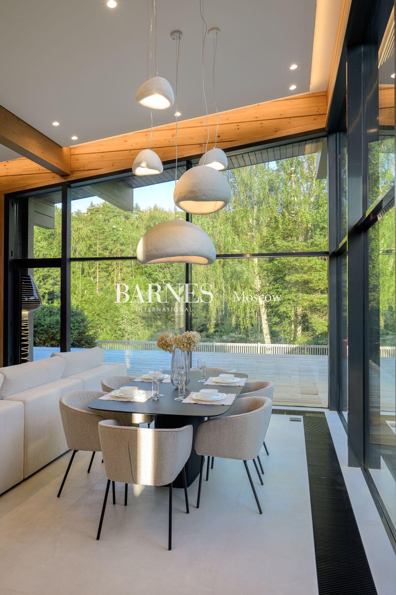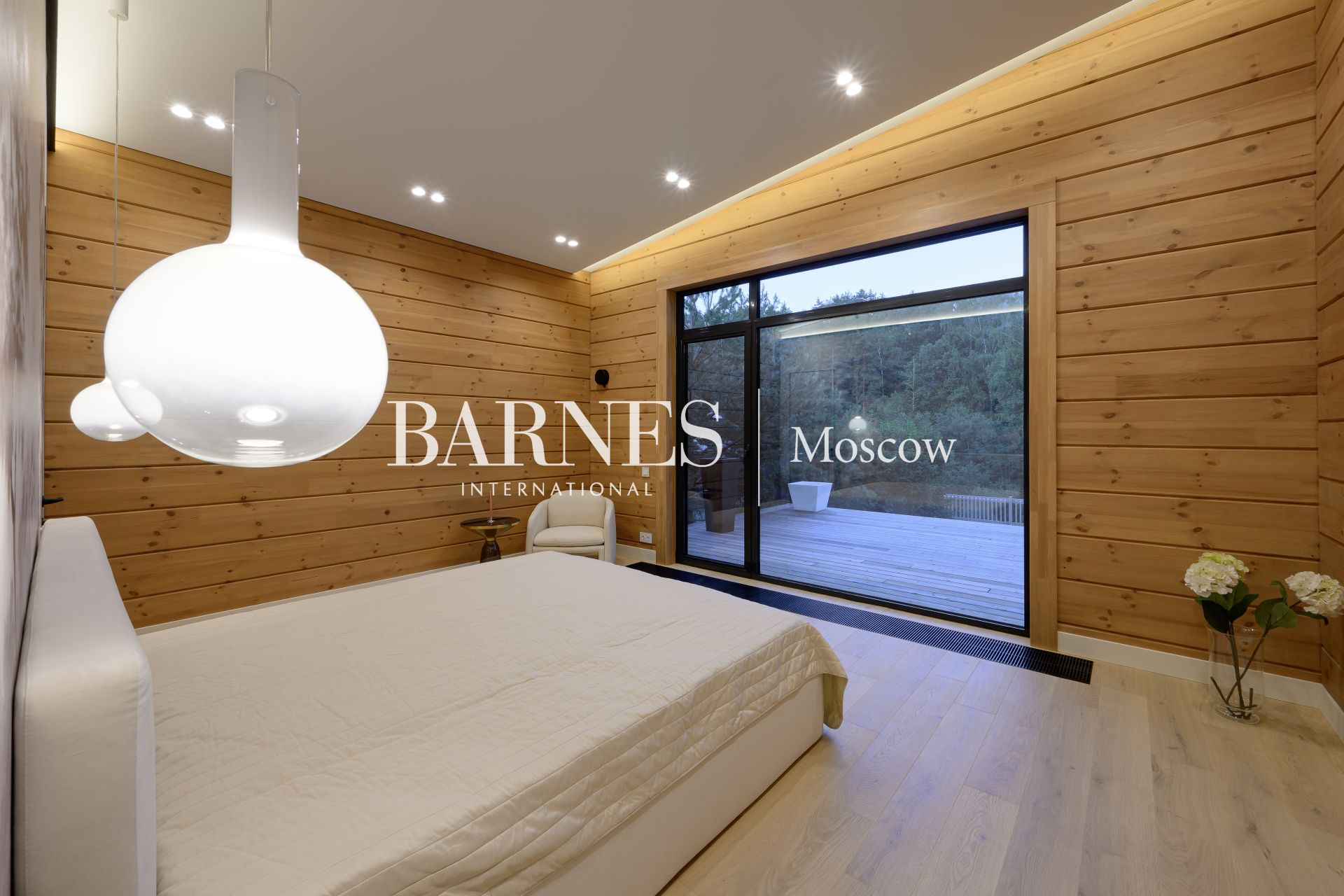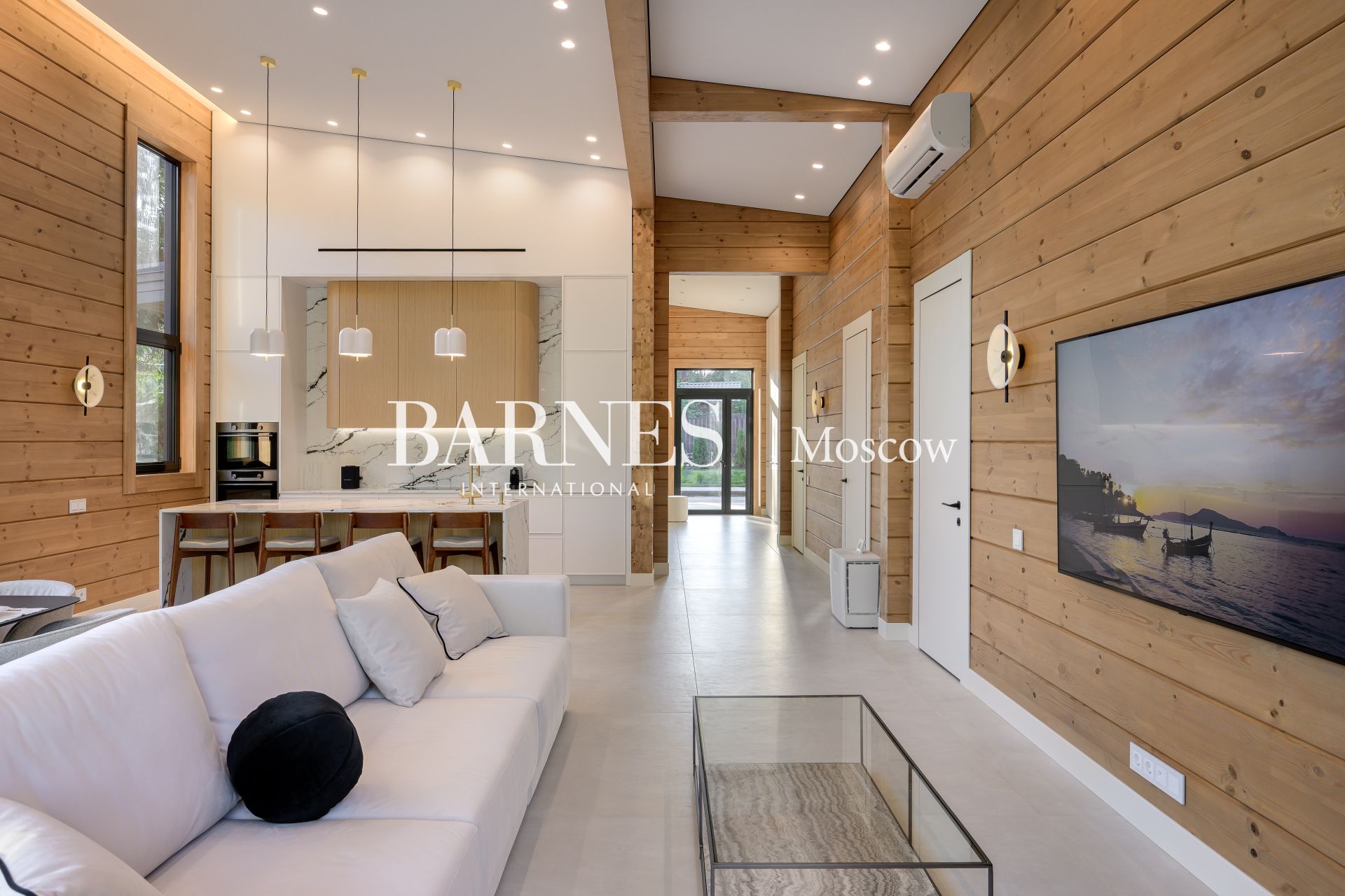 Архитектурный стиль дома можно охарактеризовать как современный, с элементами минимализма, что подчеркивается использованием натуральных материалов и панорамного остекления. Брус, из которого построен дом, придает ему особую теплоту и естественность, а большие окна позволяют наслаждаться видами на окружающую природу. Внутреннее пространство дома продумано до мелочей: четыре спальни и три ванные комнаты обеспечивают комфорт для всей семьи, а отделка и мебель создают атмосферу изысканности и уюта.