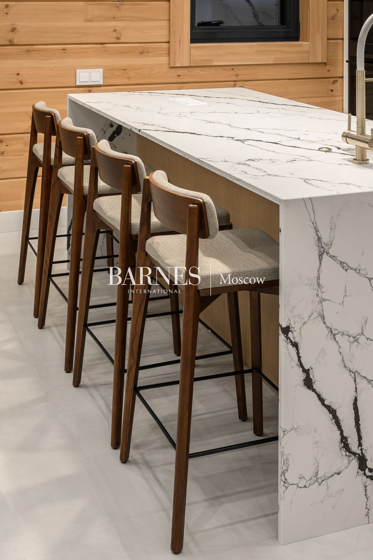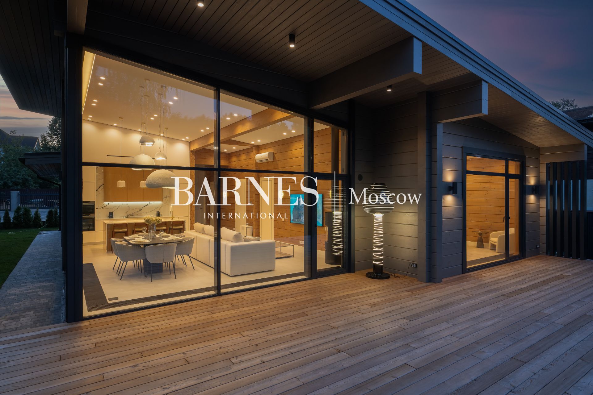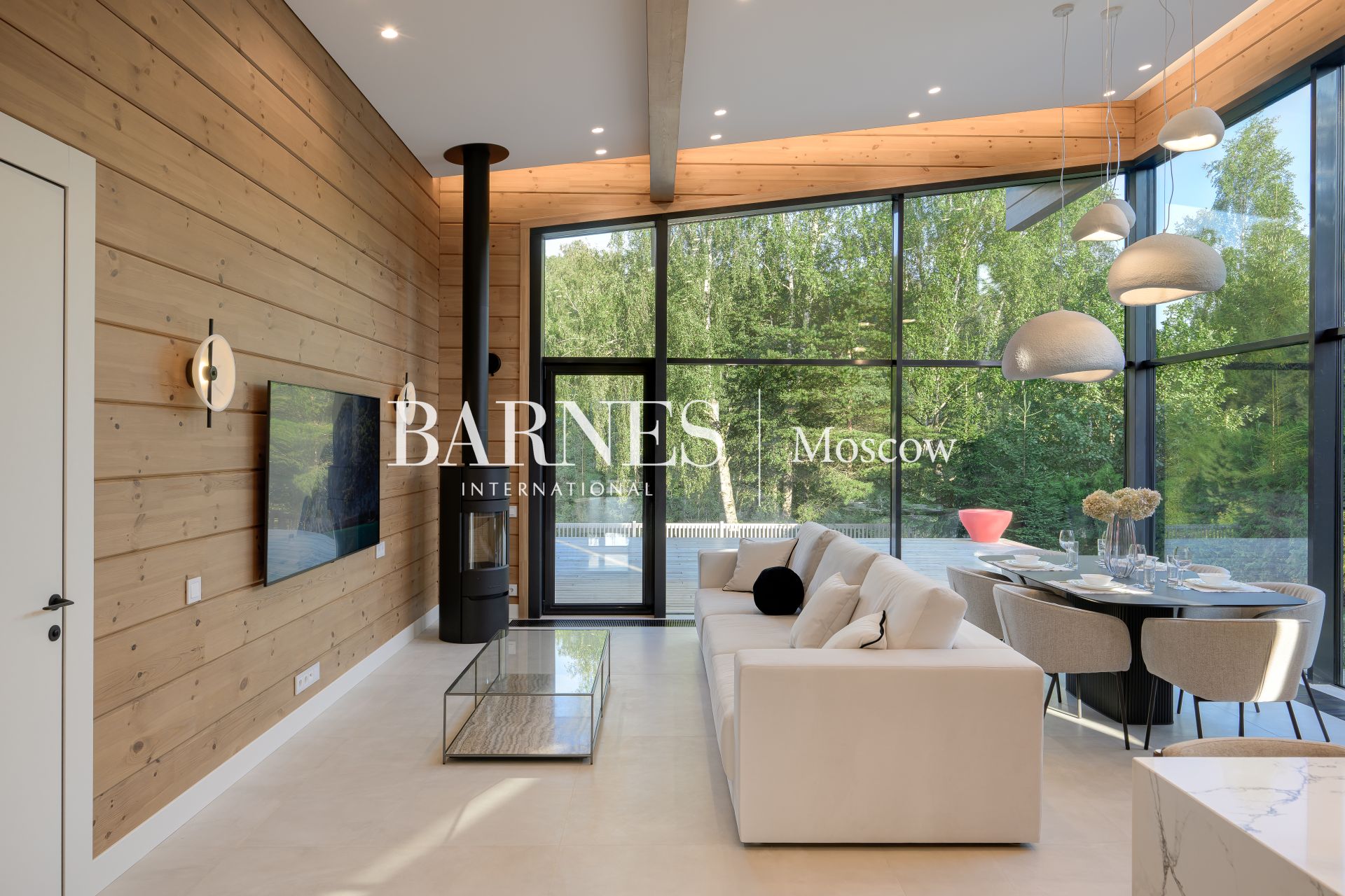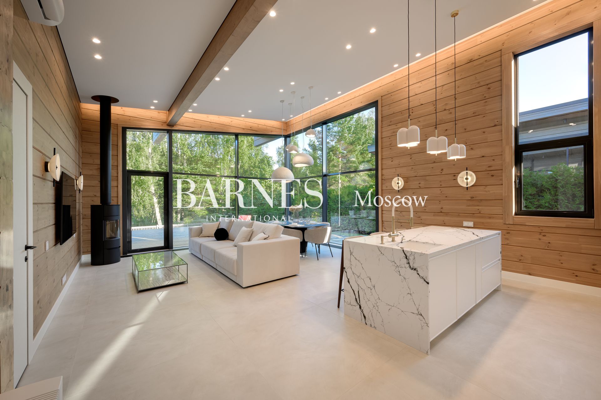 Архитектурный стиль дома можно охарактеризовать как современный, с элементами минимализма, что подчеркивается использованием натуральных материалов и панорамного остекления. Брус, из которого построен дом, придает ему особую теплоту и естественность, а большие окна позволяют наслаждаться видами на окружающую природу. Внутреннее пространство дома продумано до мелочей: четыре спальни и три ванные комнаты обеспечивают комфорт для всей семьи, а отделка и мебель создают атмосферу изысканности и уюта.