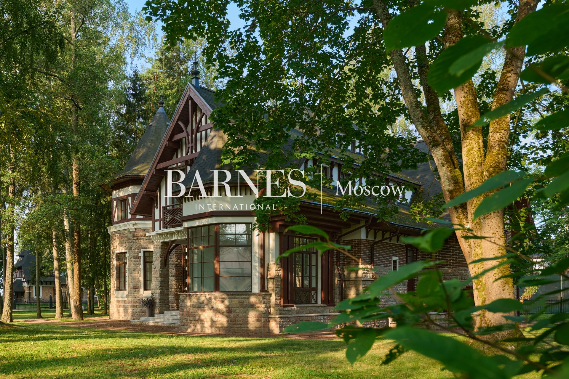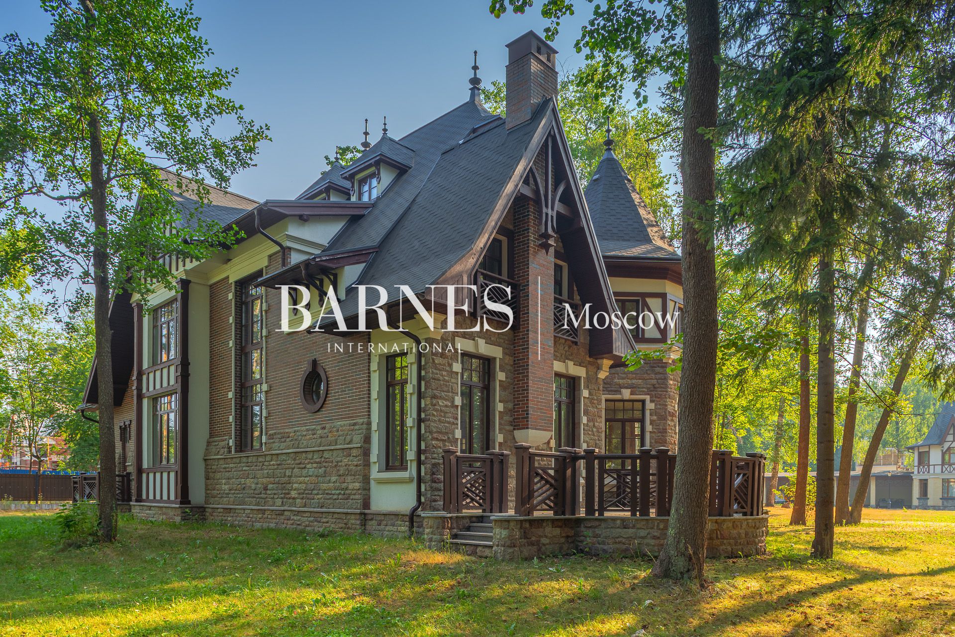 Архитектура этой резиденции - магия контрастов: суровая фактура облицовочного кирпича и рустового камня смягчена теплом дерева в элементах фахверка. Островерхие крыши и круглая башня создают узнаваемый, выразительный силуэт. Это не просто дом, это заявление.