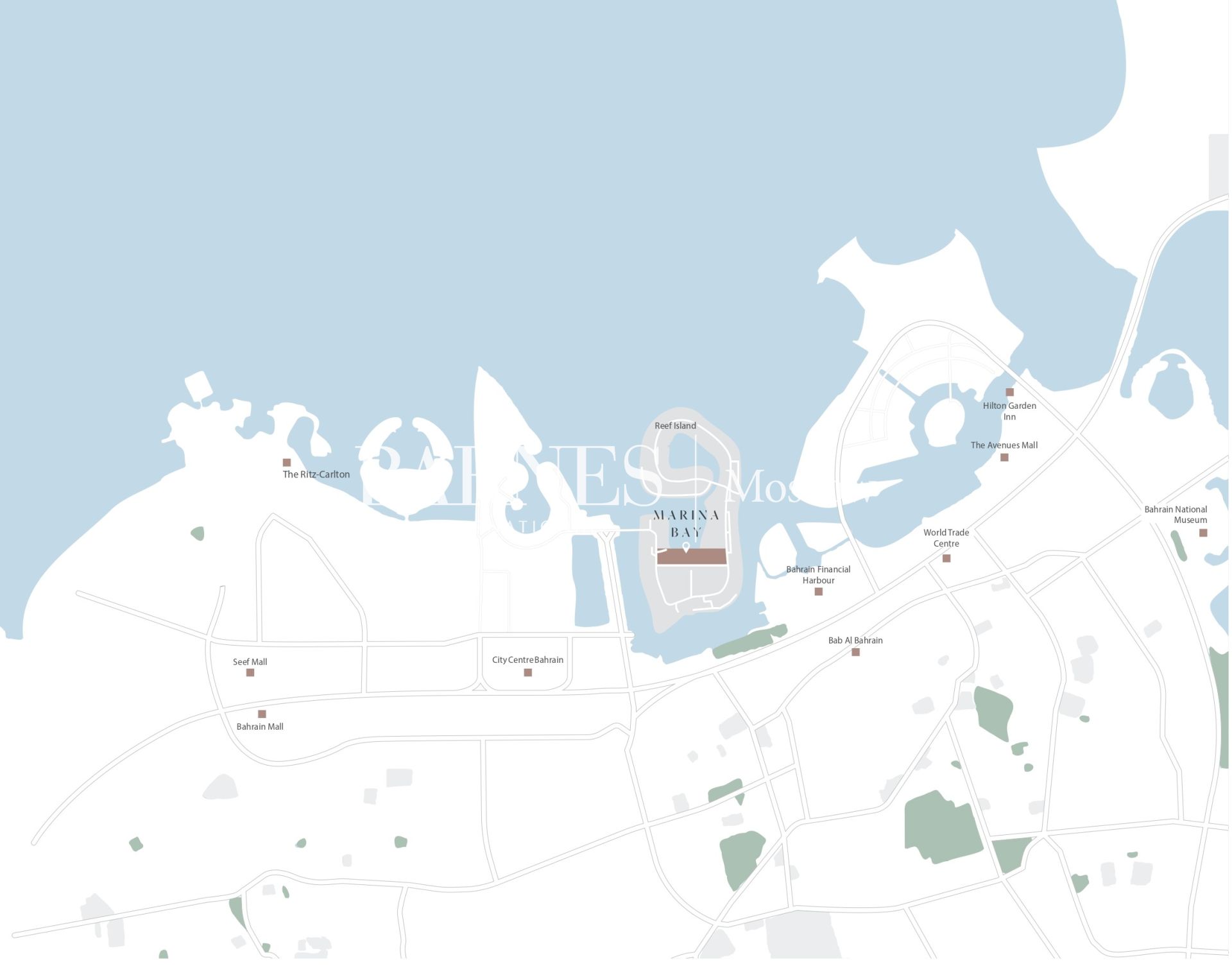 Marina Bay стратегически расположена на острове Риф — одном из самых эксклюзивных частных островов Бахрейна, между Bahrain’s City Centre, Seef District и процветающим финансовым районом. Этот район идеально связан с основными транспортными магистралями Бахрейна, обеспечивая быстрый доступ ко всем уголкам страны. Комплекс находится всего в 15 минутах езды от международного аэропорта Бахрейна, что делает его удобным центром для инвесторов со всего мира.