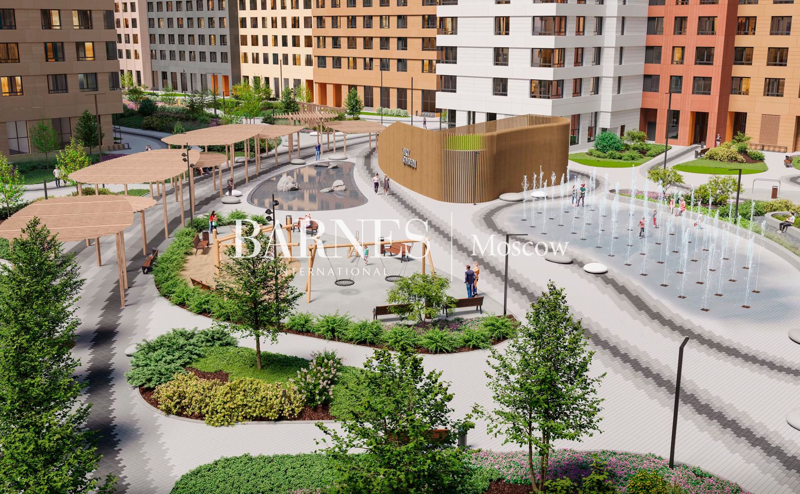 Sky Garden – жилой комплекс из 4 корпусов с секциями переменной этажности от 12 до 44 этажей, выполненными в спокойной тонах с яркими бирюзовыми акцентами. Центральное лобби со стойкой консьержа, детской игровой комнатой и зоной коворкинга, а в подъездах с дизайнерской отделкой предусмотрены колясочные и лапомойки.