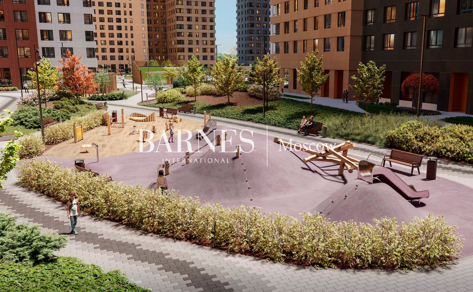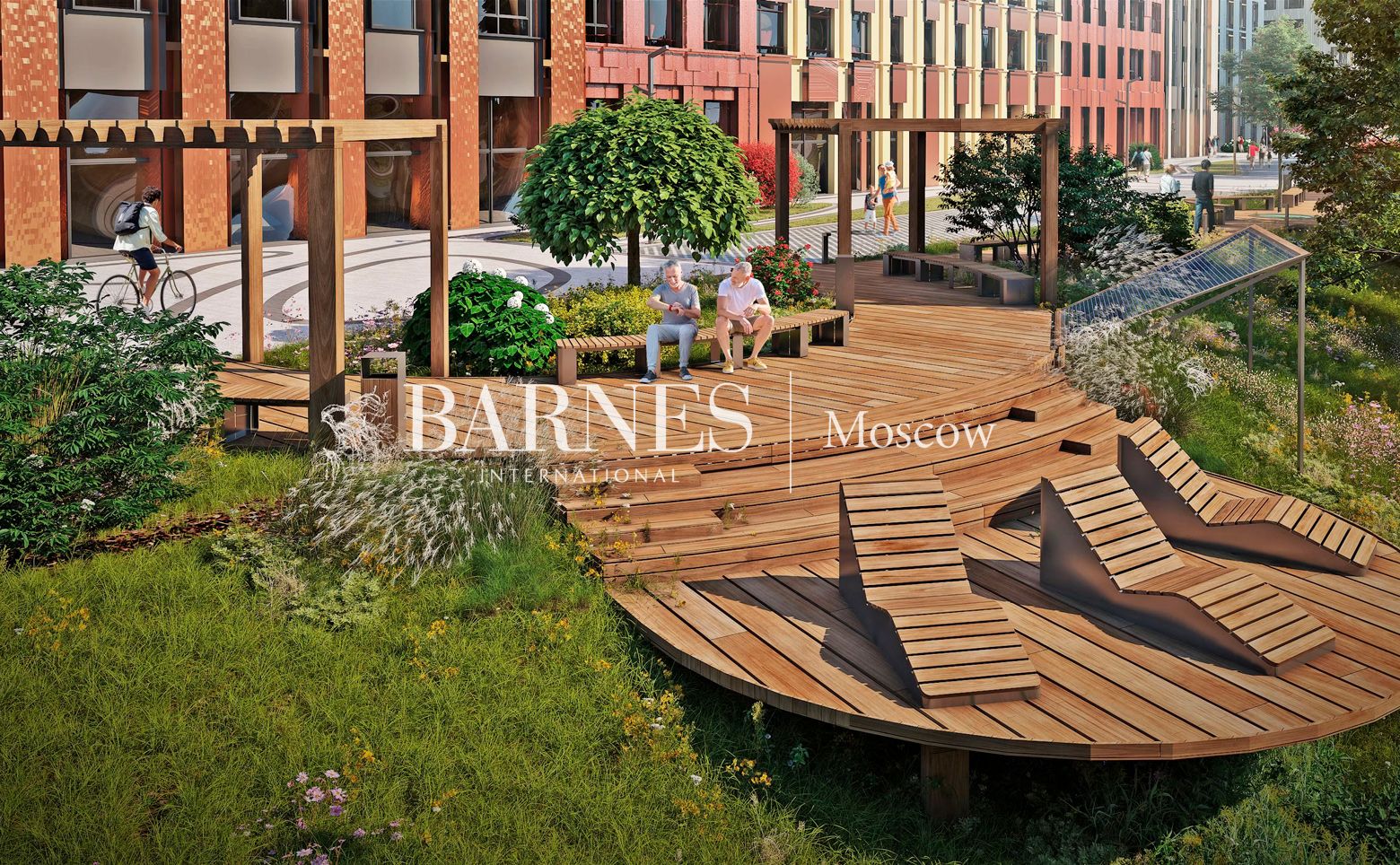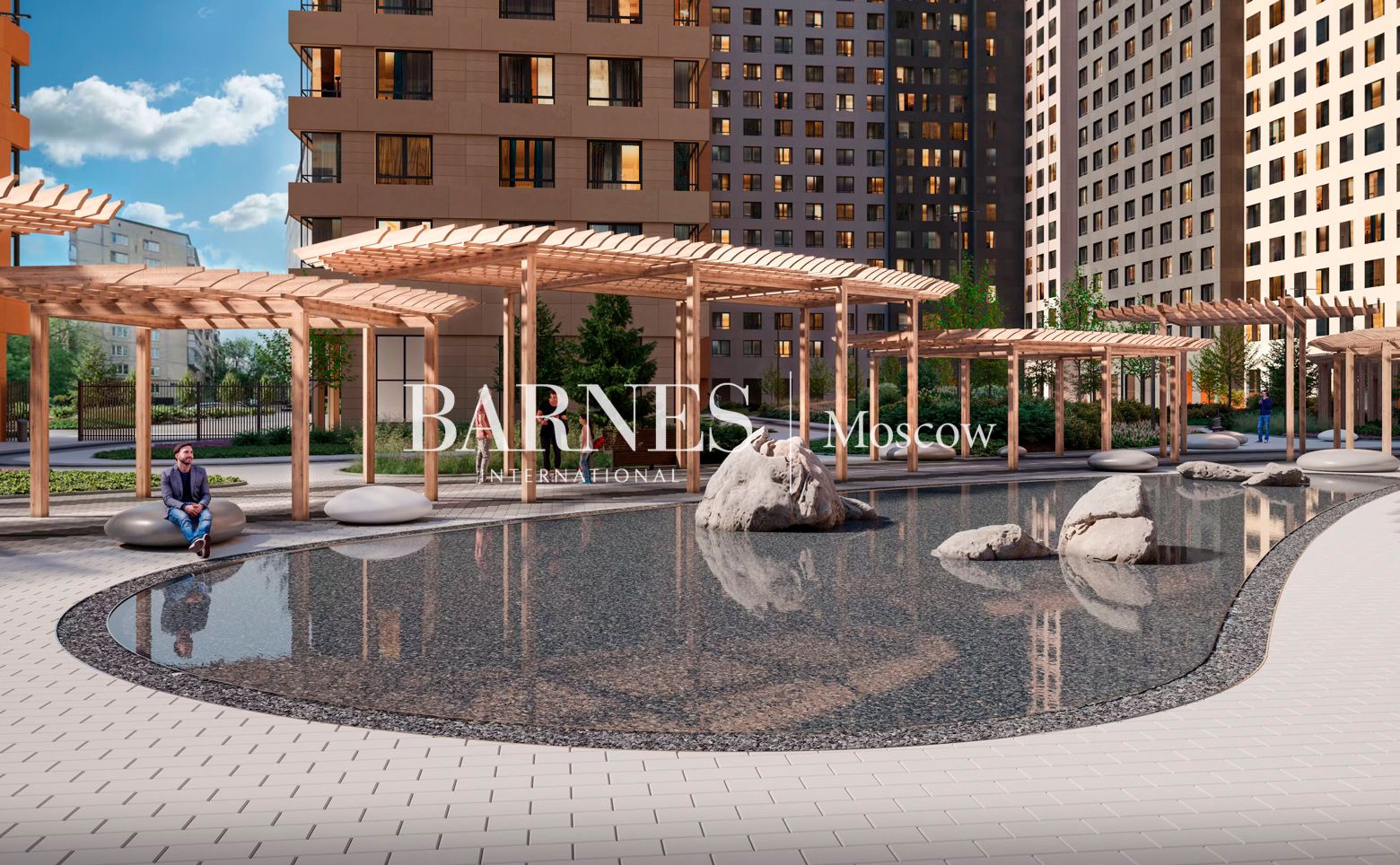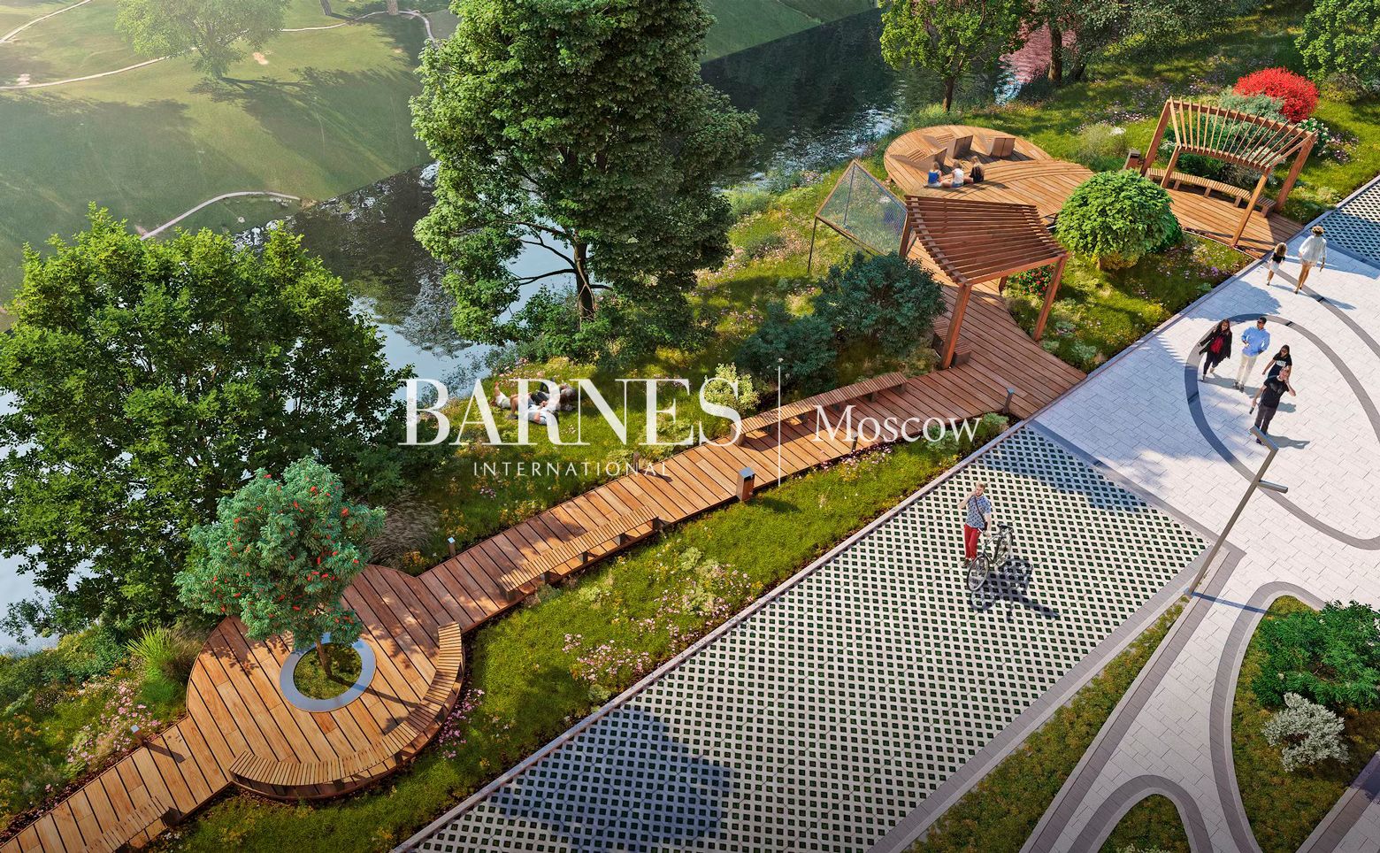Внутренняя территория площадью 3,85 га с центральной площадью, сухим фонтаном и декоративным прудом, зонами для отдыха, игровыми и спортивными площадками. Прилегающая набережная реки благоустроена для прогулок и отдыха у воды. Предусмотрен подземный паркинг с комнатами для хранения велосипедов.